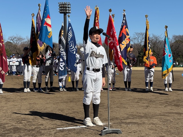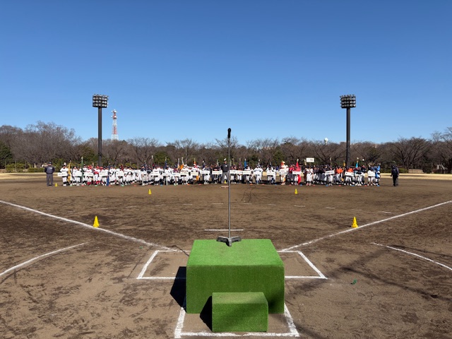 2026年度ジャビットカップ争奪・第26回春季大会の開会式が、3月8日、快晴で肌寒い中、都立大泉中央公園内野球場にて行われました。大泉第二中学校吹奏楽部の演奏のもと、25チームの選手が例年以上に元気よくグラウンド内を行進しました。新チームによる2026年度の大会が始まります。練習の成果を発揮してください。